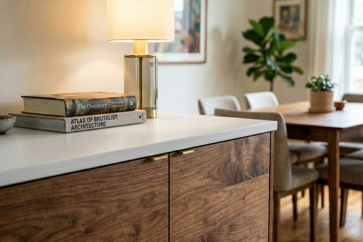 - Transición perfecta: Un aparador de nogal con una fina tapa de Corian® en el comedor es el nexo ideal para unificar ambientes abiertos, aportando luz y una superficie ultrarresistente.